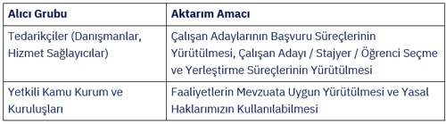Kişisel veriler, aşağıdaki amaçlar çerçevesinde ve yalnızca bu amaçların gerektirdiği ölçüde yine aşağıda belirtilen alıcı gruplarına aktarılabilecektir.