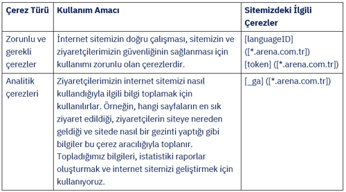 “www.arena.com.tr” adresinde yer alan internet sitemizi ziyaret eden kişilerden aşağıda yer alan bilgileri toplulaştırmak ve çeşitli tedbirleri uygulamak suretiyle anonim bir biçimde toplamaktayız: